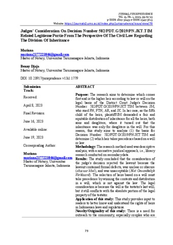 Mariana, Mariana and Djaja, Benny (2023) Judges' Consideration On Decision Number 582/PDT.G/2019/PN.JKT.TIM Related Legitieme Portie From The Perspective Of The Civil Law Regarding The Division Of Inheritance. Jurnal Jurisprudence, 13 (1).