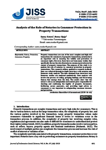 Estera, Sanny and Djaja, Benny (2023) Analysis of the Role of Notaries in Consumer Protection in Property Transactions. Journal of Indonesian Social Science,, 4 (7).