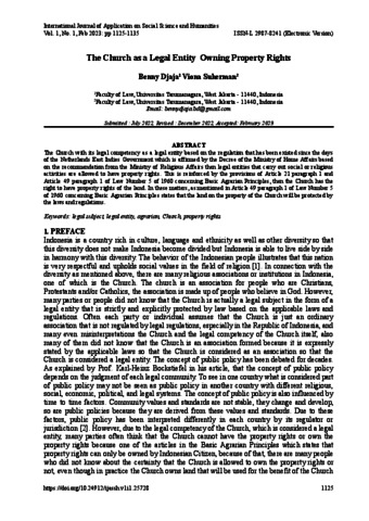 Djaja, Benny and Suherman, Viona (2023) The Church as a Legal Entity Owning Property Rights. International Journal of Application on Social Science and Humanities, 1 (1).