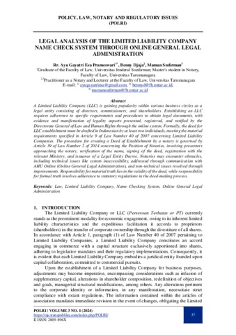 Prameswari, Rr. Ayu Gayatri Esa and Djaja, Benny and Sudirman, Maman (2024) Legal Analysis Of The Limited Liability Company Name Check System Through Online General Legal Administration. POLRI, 3 (1).