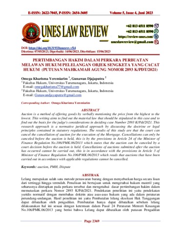 Yeremiarim, Omega Kharisma and Djajaputra, Gunawan (2023) Pertimbangan Hakim Dalam Perkara Perbuatan Melawan Hukum Pelelangan Objek Sengketa Yang Cacat Hukum (Putusan Mahkamah Agung Nomor 2893 K/PDT/2021). Unes Law Review, 5 (4).