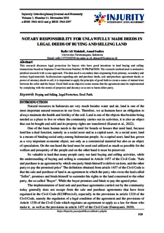 Mahdafi, Rafki Ali and Sudiro, Amad (2023) NOTARY RESPONSIBILITY FOR UNLAWFULLY MADE DEEDS IN LEGAL DEEDS OF BUYING AND SELLING LAND. Injuruty: Interdiciplinary Journal and Humanity, 2 (11).