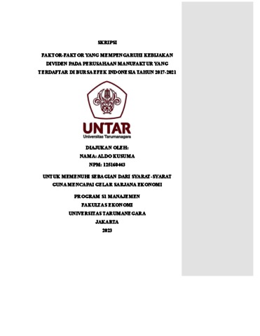 KUSUMA, ALDO (2023) FAKTOR-FAKTOR YANG MEMPENGARUHI KEBIJAKAN DIVIDEN PADA PERUSAHAAN MANUFAKTUR YANG TERDAFTAR DI BURSA EFEK INDONESIA TAHUN 2017-2021. Skripsi thesis, Universitas Tarumanagara.