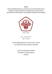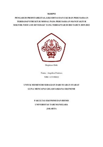 Frarisca, Angelica (2022) PENGARUH PROFITABILITAS, LIKUIDITAS DAN UKURAN PERUSAHAAN TERHADAP STRUKTUR MODAL PADA PERUSAHAAN MANUFAKTUR SEKTOR FOOD AND BEVERAGE YANG TERDAFTAR DI BEI TAHUN 2019-2022. Skripsi thesis, Universitas Tarumanagara.