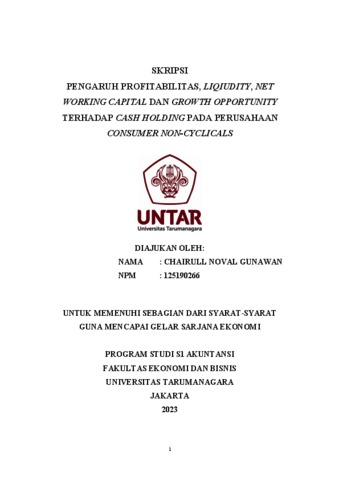 Gunawan, Chairull Noval (2023) PENGARUH PROFITABILITAS, LIQIUDITY, NET WORKING CAPITAL DAN GROWTH OPPORTUNITY TERHADAP CASH HOLDING PADA PERUSAHAAN CONSUMER NON-CYCLICALS. Skripsi thesis, Universitas Tarumanagara.