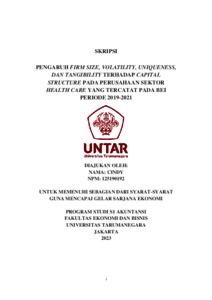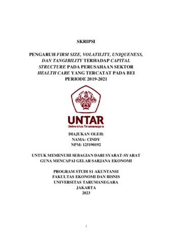 CINDY, CINDY (2023) PENGARUH FIRM SIZE, VOLATILITY, UNIQUENESS, DAN TANGIBILITY TERHADAP CAPITAL STRUCTURE PADA PERUSAHAAN SEKTOR HEALTH CARE YANG TERCATAT PADA BEI PERIODE 2019-2021. Skripsi thesis, Universitas Tarumanagara.