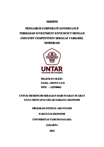 LUO, FENNY (2023) PENGARUH CORPORATE GOVERNANCE TERHADAP INVESTMENT EFFICIENCY DENGAN INDUSTRY COMPETITION SEBAGAI VARIABEL MODERASI. Skripsi thesis, Universitas Tarumanagara.