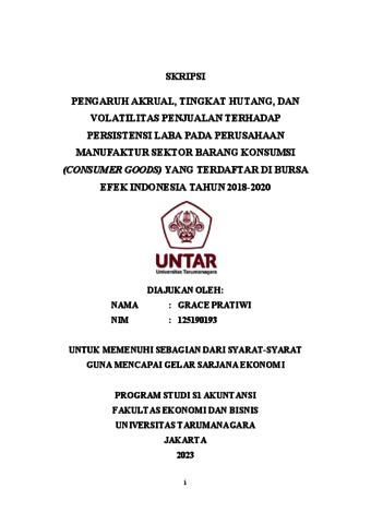 PRATIWI, GRACE (2023) PENGARUH AKRUAL, TINGKAT HUTANG, DAN VOLATILITAS PENJUALAN TERHADAP PERSISTENSI LABA PADA PERUSAHAAN MANUFAKTUR SEKTOR BARANG KONSUMSI (CONSUMER GOODS) YANG TERDAFTAR DI BURSA EFEK INDONESIA TAHUN 2018-2020. Skripsi thesis, Universitas Tarumanagara.