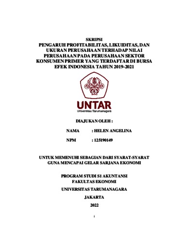 ANGELINA, HELEN (2022) PENGARUH PROFITABILITAS, LIKUIDITAS, DAN UKURAN PERUSAHAAN TERHADAP NILAI PERUSAHAAN PADA PERUSAHAAN SEKTOR KONSUMEN PRIMER YANG TERDAFTAR DI BURSA EFEK INDONESIA TAHUN 2019-2021. Skripsi thesis, Universitas Tarumanagara.