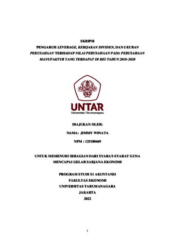 WINATA, JIMMY (2022) PENGARUH LEVERAGE, KEBIJAKAN DIVIDEN, DAN UKURAN PERUSAHAAN TERHADAP NILAI PERUSAHAAN PADA PERUSAHAAN MANUFAKTUR YANG TERDAPAT DI BEI TAHUN 2018-2020. Skripsi thesis, Universitas Tarumanagara.