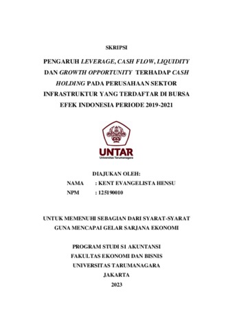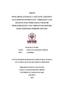 HENSU, KENT EVANGELISTA (2023) PENGARUH LEVERAGE, CASH FLOW, LIQUIDITY DAN GROWTH OPPORTUNITY TERHADAP CASH HOLDING PADA PERUSAHAAN SEKTOR INFRASTRUKTUR YANG TERDAFTAR DI BURSA EFEK INDONESIA PERIODE 2019-2021. Skripsi thesis, Universitas Tarumanagara.