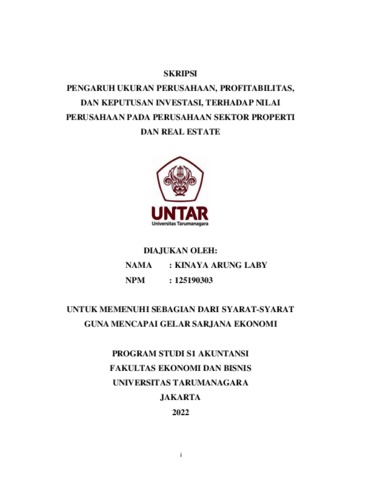LABY, KINAYA ARUNG (2022) PENGARUH UKURAN PERUSAHAAN, PROFITABILITAS, DAN KEPUTUSAN INVESTASI, TERHADAP NILAI PERUSAHAAN PADA PERUSAHAAN SEKTOR PROPERTI DAN REAL ESTATE. Skripsi thesis, Universitas Tarumanagara.