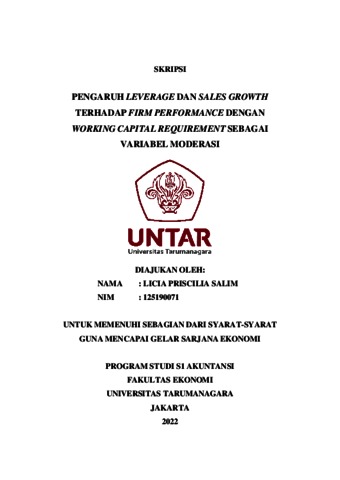 SALIM, LICIA PRISCILIA (2022) PENGARUH LEVERAGE DAN SALES GROWTH TERHADAP FIRM PERFORMANCE DENGAN WORKING CAPITAL REQUIREMENT SEBAGAI VARIABEL MODERASI. Skripsi thesis, Universitas Tarumanagara.
