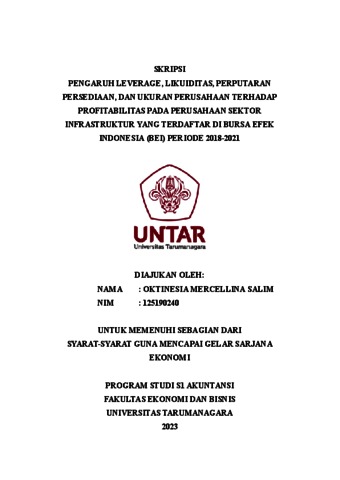 SALIM, OKTINESIA MERCELLINA (2023) PENGARUH LEVERAGE, LIKUIDITAS, PERPUTARAN PERSEDIAAN, DAN UKURAN PERUSAHAAN TERHADAP PROFITABILITAS PADA PERUSAHAAN SEKTOR INFRASTRUKTUR YANG TERDAFTAR DI BURSA EFEK INDONESIA (BEI) PERIODE 2018-2021. Skripsi thesis, Universitas Tarumanagara.