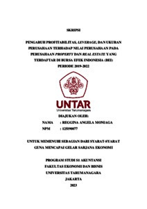MONIAGA, REGGINA ANGELA (2023) PENGARUH PROFITABILITAS, LEVERAGE, DAN UKURAN PERUSAHAAN TERHADAP NILAI PERUSAHAAN PADA PERUSAHAAN PROPERTY DAN REAL ESTATE YANG TERDAFTAR DI BURSA EFEK INDONESIA (BEI) PERIODE 2019-2022. Skripsi thesis, Universitas Tarumanagara.