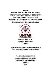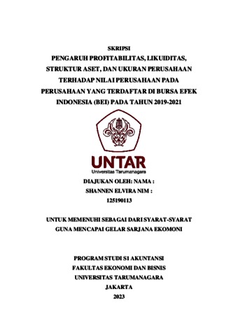 ELVIRA, SHANNEN (2023) PENGARUH PROFITABILITAS, LIKUIDITAS, STRUKTUR ASET, DAN UKURAN PERUSAHAAN TERHADAP NILAI PERUSAHAAN PADA PERUSAHAAN YANG TERDAFTAR DI BURSA EFEK INDONESIA (BEI) PADA TAHUN 2019-2021. Skripsi thesis, Universitas Tarumanagara.
