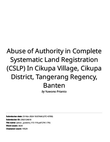Prianto, Yuwono and Trianto, Ahmad and Rizki, Muhammad Abdul Jamil Turnitin: Abuse of Authority in Complete Systematic Land Registration (CSLP) In Cikupa Village, Cikupa District, Tangerang Regency, Banten. International Journal of Engineering Business and Social Science.