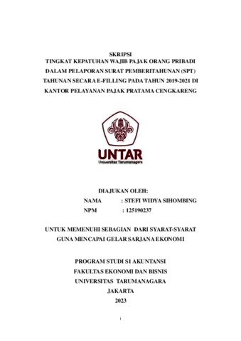 SIHOMBING, STEFI WIDYA (2023) TINGKAT KEPATUHAN WAJIB PAJAK ORANG PRIBADI DALAM PELAPORAN SURAT PEMBERITAHUNAN (SPT) TAHUNAN SECARA E-FILLING PADA TAHUN 2019-2021 DI KANTOR PELAYANAN PAJAK PRATAMA CENGKARENG. Skripsi thesis, Universitas Tarumanagara.