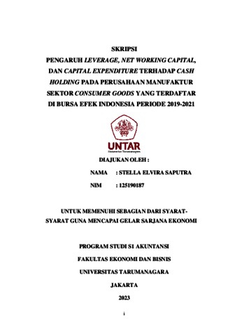 SAPUTRA, STELLA ELVIRA (2023) PENGARUH LEVERAGE, NET WORKING CAPITAL, DAN CAPITAL EXPENDITURE TERHADAP CASH HOLDING PADA PERUSAHAAN MANUFAKTUR SEKTOR CONSUMER GOODS YANG TERDAFTAR DI BURSA EFEK INDONESIA PERIODE 2019-2021. Skripsi thesis, Universitas Tarumanagara.