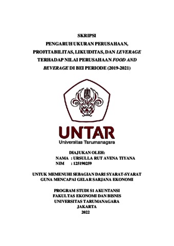 TIYANA, URSULLA RUT AVENA (2022) PENGARUH UKURAN PERUSAHAAN, PROFITABILITAS, LIKUIDITAS, DAN LEVERAGE TERHADAP NILAI PERUSAHAAN FOOD AND BEVERAGE DI BEI PERIODE (2019-2021). Skripsi thesis, Universitas Tarumanagara.
