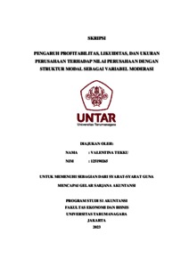TEKKU, VALENTINA (2023) PENGARUH PROFITABILITAS, LIKUIDITAS, DAN UKURAN PERUSAHAAN TERHADAP NILAI PERUSAHAAN DENGAN STRUKTUR MODAL SEBAGAI VARIABEL MODERASI. Skripsi thesis, Universitas Tarumanagara.