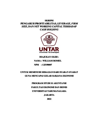 ROMEL, WILLIAM (2022) PENGARUH PROFITABILITAS, LEVERAGE, FIRM SIZE, DAN NET WORKING CAPITAL TERHADAP CASH HOLDING. Skripsi thesis, Universitas Tarumanagara.
