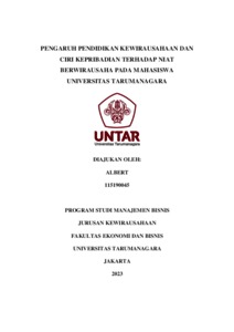 ALBERT, ALBERT (2023) PENGARUH PENDIDIKAN KEWIRAUSAHAAN DAN CIRI KEPRIBADIAN TERHADAP NIAT BERWIRAUSAHA PADA MAHASISWA UNIVERSITAS TARUMANAGARA. Skripsi thesis, Universitas Tarumanagara.