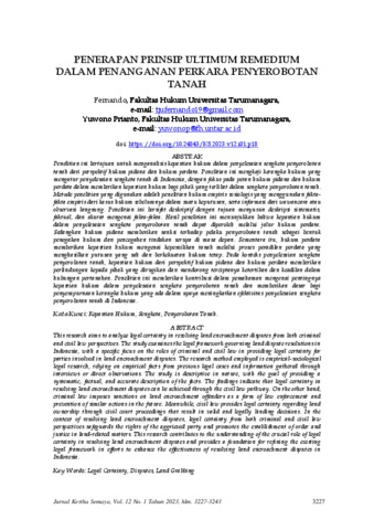 Fernando, Fernando and Prianto, Yuwono (2023) PENERAPAN PRINSIP ULTIMUM REMEDIUM DALAM PENANGANAN PERKARA PENYEROBOTAN TANAH. Jurnal Kertha Semaya, 1 (12).
