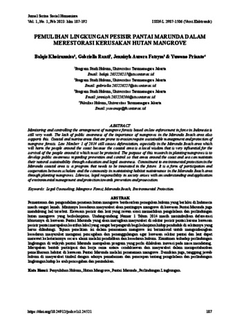 Khoirunnisa, Balqis and Ranti, Gabriella and Fatsym, Jennisyh Aurora and Prianto, Yuwono (2023) PEMULIHAN LINGKUNGAN PESISIR PANTAI MARUNDA DALAM MERESTORASI KERUSAKAN HUTAN MANGROVE. Jurnal Serina Sosial Humaniora, 1 (1).