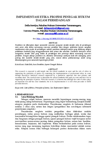 Savelya, Della and Prianto, Yuwono (2023) IMPLEMENTASI ETIKA PROFESI PENEGAK HUKUM DALAM PERSIDANGAN. Jurnal Kertha Semaya, 11 (12).