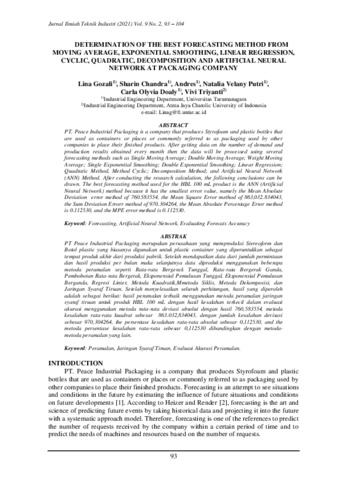 Lina Gozali, Pertama and Sharin Chandra, kedua and ndres, Ketiga and Natalia Velany Putri, keempat and Carla Olyvia Doaly, Kelima and Vivi Triyanti, Keenam DETERMINATION OF THE BEST FORECASTING METHOD FROM MOVING AVERAGE, EXPONENTIAL SMOOTHING, LINEAR REGRESSION, CYCLIC, QUADRATIC, DECOMPOSITION AND ARTIFICIAL NEURAL NETWORK AT PACKAGING COMPANY. DETERMINATION OF THE BEST FORECASTING METHOD FROM MOVING AVERAGE, EXPONENTIAL SMOOTHING, LINEAR REGRESSION, CYCLIC, QUADRATIC, DECOMPOSITION AND ARTIFICIAL NEURAL NETWORK AT PACKAGING COMPANY.