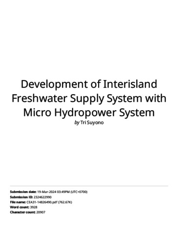 Pranoto, Wati Asriningsih (2023) Development of Interisland Freshwater Supply System with Micro Hydropower System. Civil Engineering and Architecture, 11 (1). ISSN 2332-1091