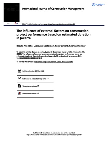 Basuki Anondho, Pertama and Lydiawati Soelaiman, Kedua and Yusuf Latief, Ketiga and Krishna Mochtar, Keempat The influence of external factors on construction project performance based on estimated duration in Jakarta. The influence of external factors on construction project performance based on estimated duration in Jakarta.