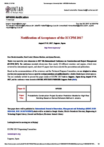 BASUKI ANONDHO Probabilistic Construction Project Duration Prediction Models for High Rise Buliding Based on Earned Schedule Method in Jakarta KORESPONDENSI.pdf Download (1MB) | Preview |
