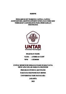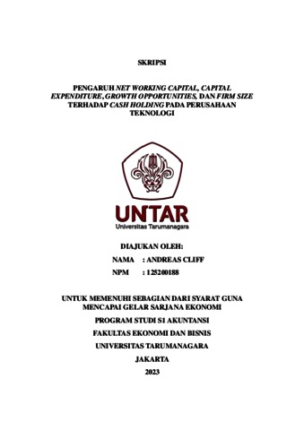 Cliff, Andreas (2023) PENGARUH NET WORKING CAPITAL, CAPITAL EXPENDITURE, GROWTH OPPORTUNITIES, DAN FIRM SIZE TERHADAP CASH HOLDING PADA PERUSAHAAN TEKNOLOGI. Skripsi thesis, Fakultas Ekonomi dan Bisnis.