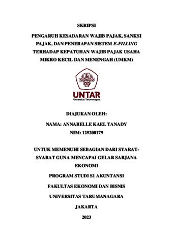 Tanady, Annabelle Kael (2023) PENGARUH KESADARAN WAJIB PAJAK, SANKSI PAJAK, DAN PENERAPAN SISTEM E-FILLING TERHADAP KEPATUHAN WAJIB PAJAK USAHA MIKRO KECIL DAN MENENGAH (UMKM). Skripsi thesis, Fakultas Ekonomi dan Bisnis.