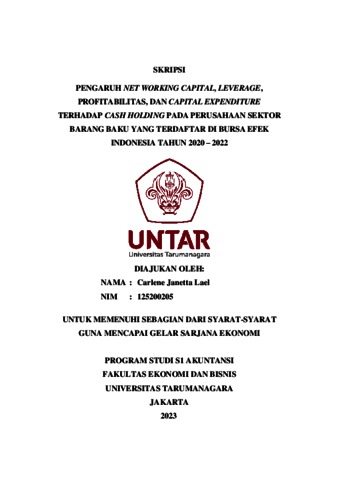 Lael, Carlene Janetta (2023) PENGARUH NET WORKING CAPITAL, LEVERAGE, PROFITABILITAS, DAN CAPITAL EXPENDITURE TERHADAP CASH HOLDING PADA PERUSAHAAN SEKTOR BARANG BAKU YANG TERDAFTAR DI BURSA EFEK INDONESIA TAHUN 2020 – 2022. Skripsi thesis, Universitas Tarumanagara.