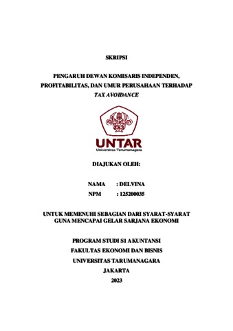 Delvina, Delvina (2023) PENGARUH DEWAN KOMISARIS INDEPENDEN, PROFITABILITAS, DAN UMUR PERUSAHAAN TERHADAP TAX AVOIDANCE. Skripsi thesis, Universitas Tarumanagara.