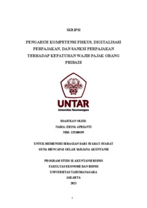 Aprianti, Erina (2023) PENGARUH KOMPETENSI FISKUS, DIGITALISASI PERPAJAKAN, DAN SANKSI PERPAJAKAN TERHADAP KEPATUHAN WAJIB PAJAK ORANG PRIBADI. Skripsi thesis, Fakultas Ekonomi dan Bisnis.