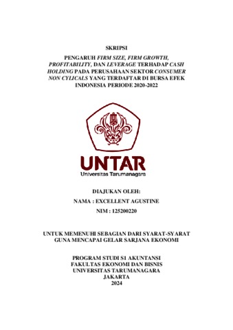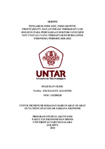 Agustine, Excellent (2023) PENGARUH FIRM SIZE, FIRM GROWTH, PROFITABILITY, DAN LEVERAGE TERHADAP CASH HOLDING PADA PERUSAHAAN SEKTOR CONSUMER NON CYLICALS YANG TERDAFTAR DI BURSA EFEK INDONESIA PERIODE 2020-2022. Skripsi thesis, Fakultas Ekonomi dan Bisnis.
