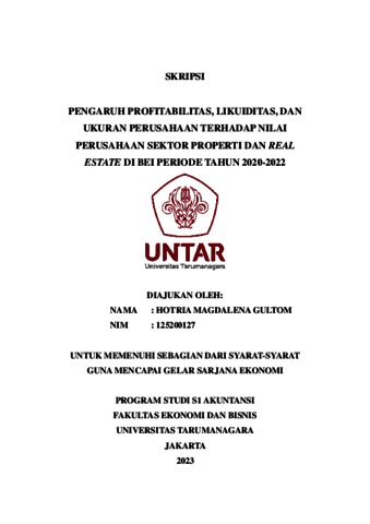 Gultom, Hotria Magdalena (2023) PENGARUH PROFITABILITAS, LIKUIDITAS, DAN UKURAN PERUSAHAAN TERHADAP NILAI PERUSAHAAN SEKTOR PROPERTI DAN REAL ESTATE DI BEI PERIODE TAHUN 2020-2022. Skripsi thesis, Fakultas Ekonomi dan Bisnis.