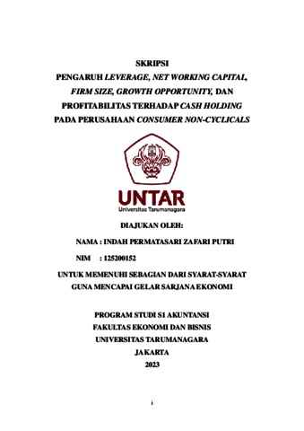 Putri, Indah Permata Sari Zafari (2023) PENGARUH LEVERAGE, NET WORKING CAPITAL, FIRM SIZE, GROWTH OPPORTUNITY, DAN PROFITABILITAS TERHADAP CASH HOLDING PADA PERUSAHAAN CONSUMER NON-CYCLICALS. Skripsi thesis, Universitas Tarumanagara.
