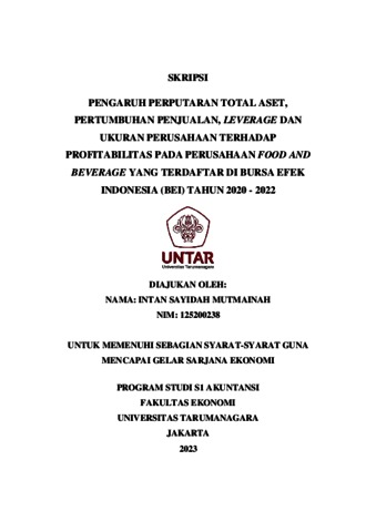 Mutmainah, Intan Sayidah (2023) PENGARUH PERPUTARAN TOTAL ASET, PERTUMBUHAN PENJUALAN, LEVERAGE DAN UKURAN PERUSAHAAN TERHADAP PROFITABILITAS PADA PERUSAHAAN FOOD AND BEVERAGE YANG TERDAFTAR DI BURSA EFEK INDONESIA (BEI) TAHUN 2020 - 2022. Skripsi thesis, Universitas Tarumanagara.