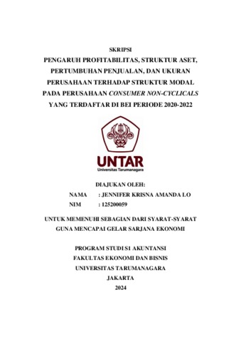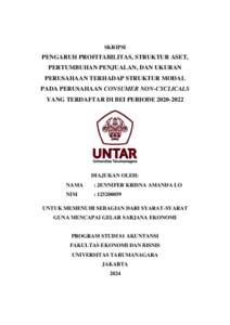 Lo, Jennifer Krisna Amanda (2023) PENGARUH PROFITABILITAS, STRUKTUR ASET, PERTUMBUHAN PENJUALAN, DAN UKURAN PERUSAHAAN TERHADAP STRUKTUR MODAL PADA PERUSAHAAN CONSUMER NON-CYCLICALS YANG TERDAFTAR DI BEI PERIODE 2020-2022. Skripsi thesis, Universitas Tarumanagara.