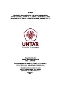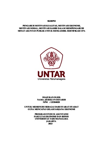 Oeyardi, Jesselyn (2023) PENGARUH MOTIVASI KUALITAS, MOTIVASI EKONOMI, MOTIVASI SOSIAL, MOTIVASI KARIR DALAM MEMPENGARUHI MINAT AKUNTAN PUBLIK UNTUK MENGAMBIL SERTIFIKASI CPA. Skripsi thesis, Universitas Tarumanagara.