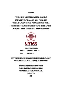 Wijaya, Jessica (2023) PENGARUH ASSET TURNOVER, CAPITAL STRUCTURE, FIRM AGE, DAN FIRM SIZE TERHADAP FINANCIAL PERFORMANCE PADA SEKTOR KONSUMEN PRIMER YANG TERDAFTAR DI BURSA EFEK INDONESIA TAHUN 2020-2022. Skripsi thesis, Universitas Tarumanagara.