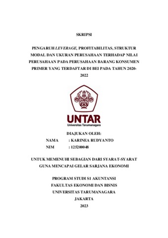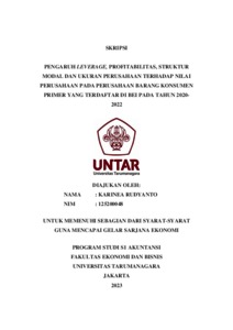 Rudyanto, Karinea (2023) PENGARUH LEVERAGE, PROFITABILITAS, STRUKTUR MODAL DAN UKURAN PERUSAHAAN TERHADAP NILAI PERUSAHAAN PADA PERUSAHAAN BARANG KONSUMEN PRIMER YANG TERDAFTAR DI BEI PADA TAHUN 2020- 2022. Skripsi thesis, Universitas Tarumanagara.