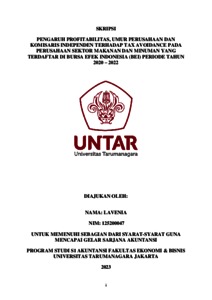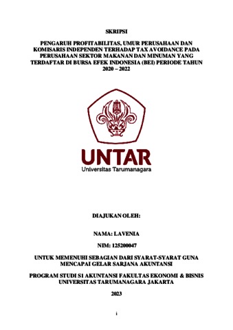 Lavenia, Lavenia (2023) PENGARUH PROFITABILITAS, UMUR PERUSAHAAN DAN KOMISARIS INDEPENDEN TERHADAP TAX AVOIDANCE PADA PERUSAHAAN SEKTOR MAKANAN DAN MINUMAN YANG TERDAFTAR DI BURSA EFEK INDONESIA (BEI) PERIODE TAHUN 2020 – 2022. Skripsi thesis, Universitas Tarumanagara.