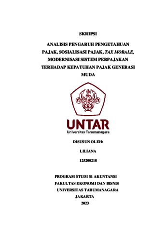 Liliana, Liliana (2023) ANALISIS PENGARUH PENGETAHUAN PAJAK, SOSIALISASI PAJAK, TAX MORALE, MODERNISASI SISTEM PERPAJAKAN TERHADAP KEPATUHAN PAJAK GENERASI MUDA. Skripsi thesis, Universitas Tarumanagara.