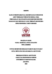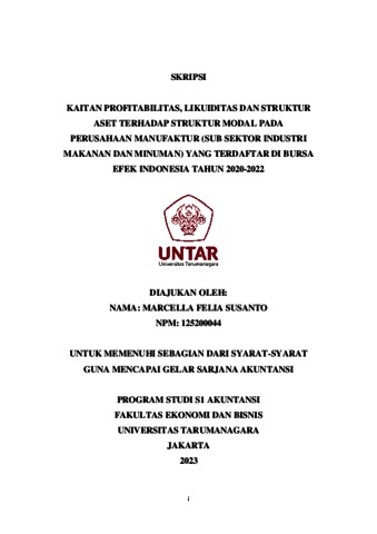 Susanto, Marcella Felia (2023) KAITAN PROFITABILITAS, LIKUIDITAS DAN STRUKTUR ASET TERHADAP STRUKTUR MODAL PADA PERUSAHAAN MANUFAKTUR (SUB SEKTOR INDUSTRI MAKANAN DAN MINUMAN) YANG TERDAFTAR DI BURSA EFEK INDONESIA TAHUN 2020-2022. Skripsi thesis, Universitas Tarumanagara.